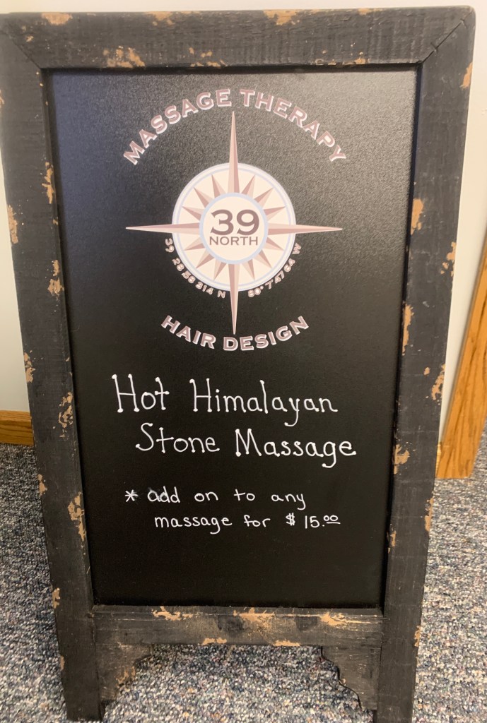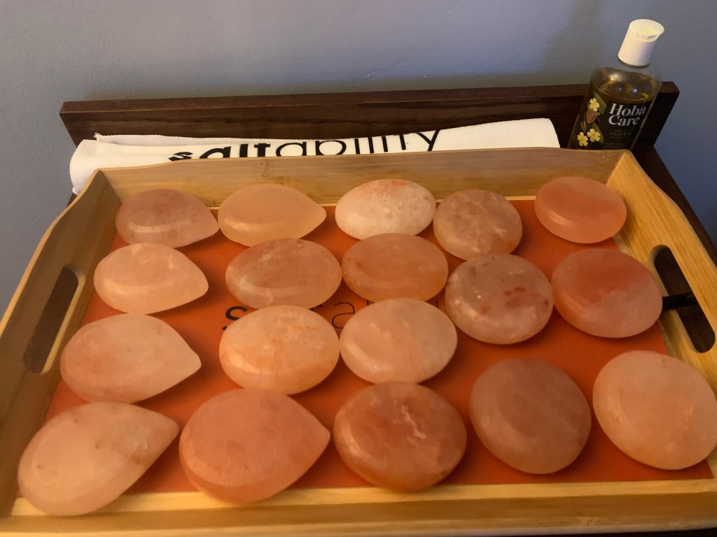 I immediately thought, I’ve never tried that. The heated pad on the massage table is luxury enough, but the thought of having heat rubbed into my body with hot, Himalayan stones was irresistible. Sign me up for that, please!