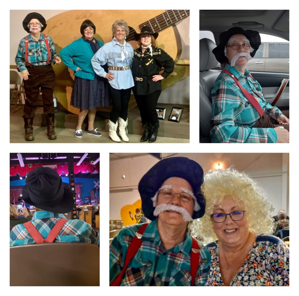 When I found out that a Dolly Parton wig and a Patsy Cline wig had been ordered by my friends, I thought I should make a costume for myself. Driving home from Myrtle Beach gave me ten hours to figure out what to wear. I googled Opry singers and the first thing that caught my attention was a pair of red suspenders on Grandpa Jones. My Dad had worn a pair just like them. As the saying goes, the rest is history!