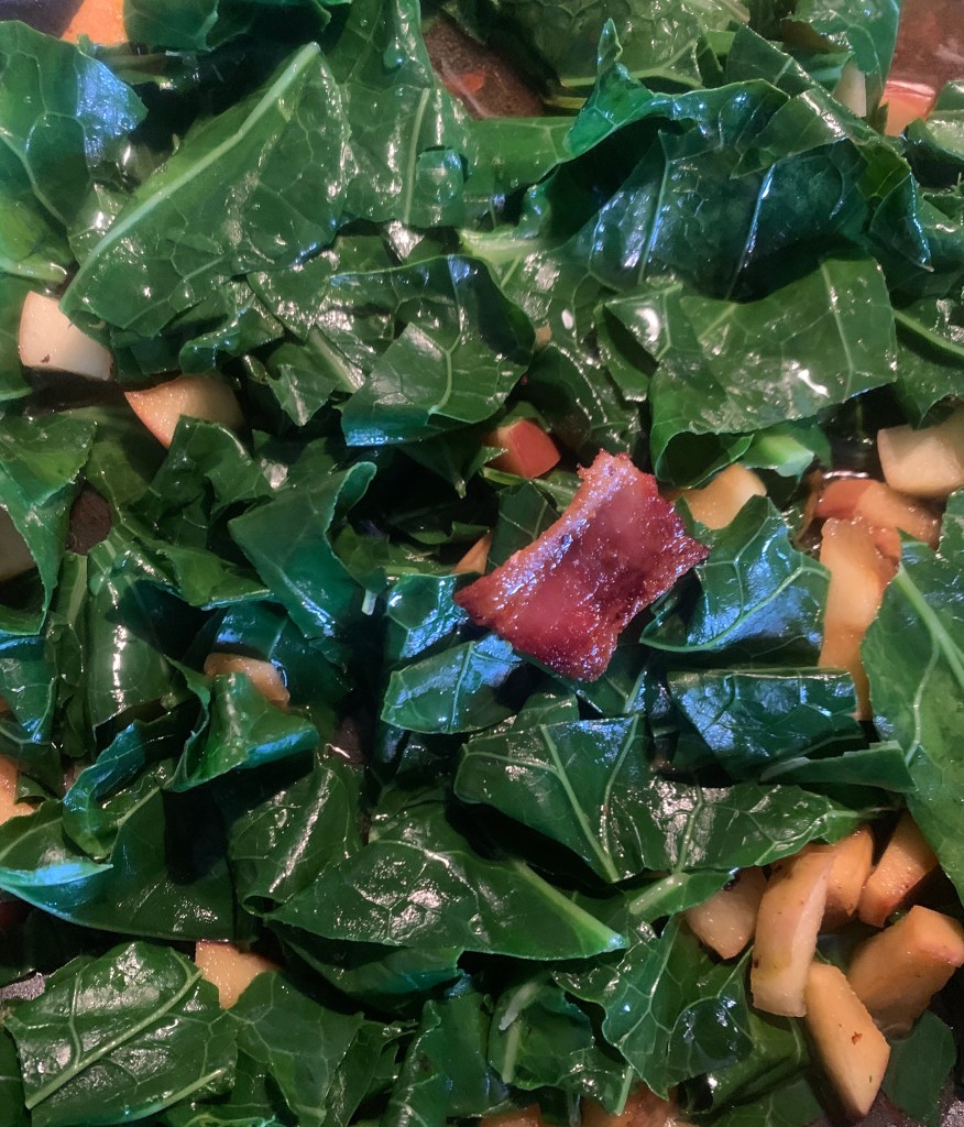 I truly believe that everything is better with bacon, so I fried a couple of slices to crumble into the final dish. I probably negated the cholesterol lowering properties of the collards by doing this but, whatever! I added chopped onion to the bacon grease, along with a chopped apple. I added the greens, a little water, and a tablespoon of apple cider vinegar, then simmered until the leaves were tender.