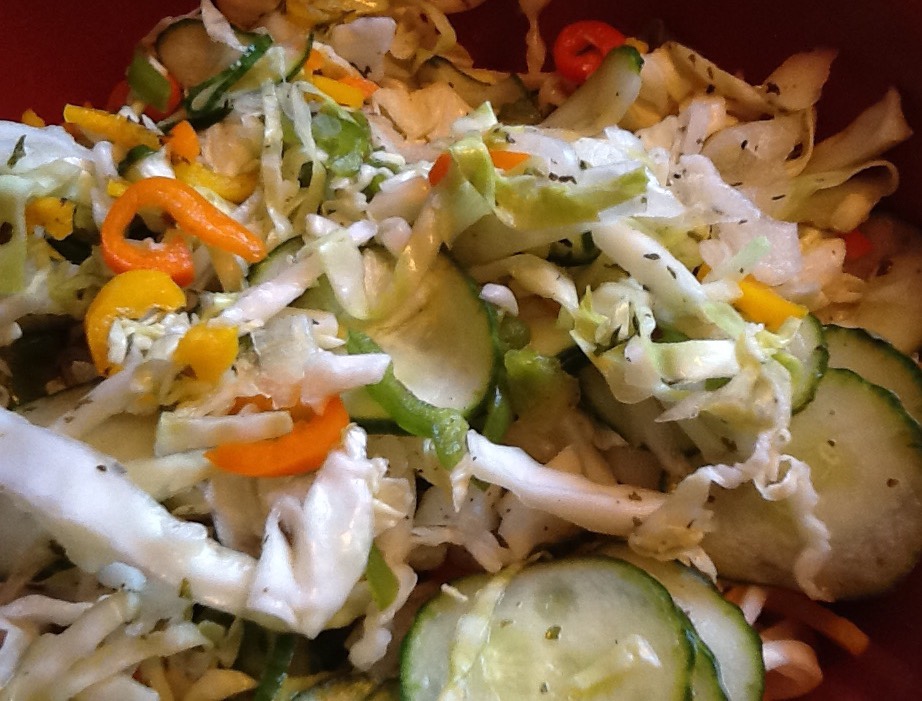 (The original recipe, given to me by my friend Judy, was called Italian Coleslaw and used just cabbage and onions with a vinegar and oil dressing. I added the other veggies and the herbs.)