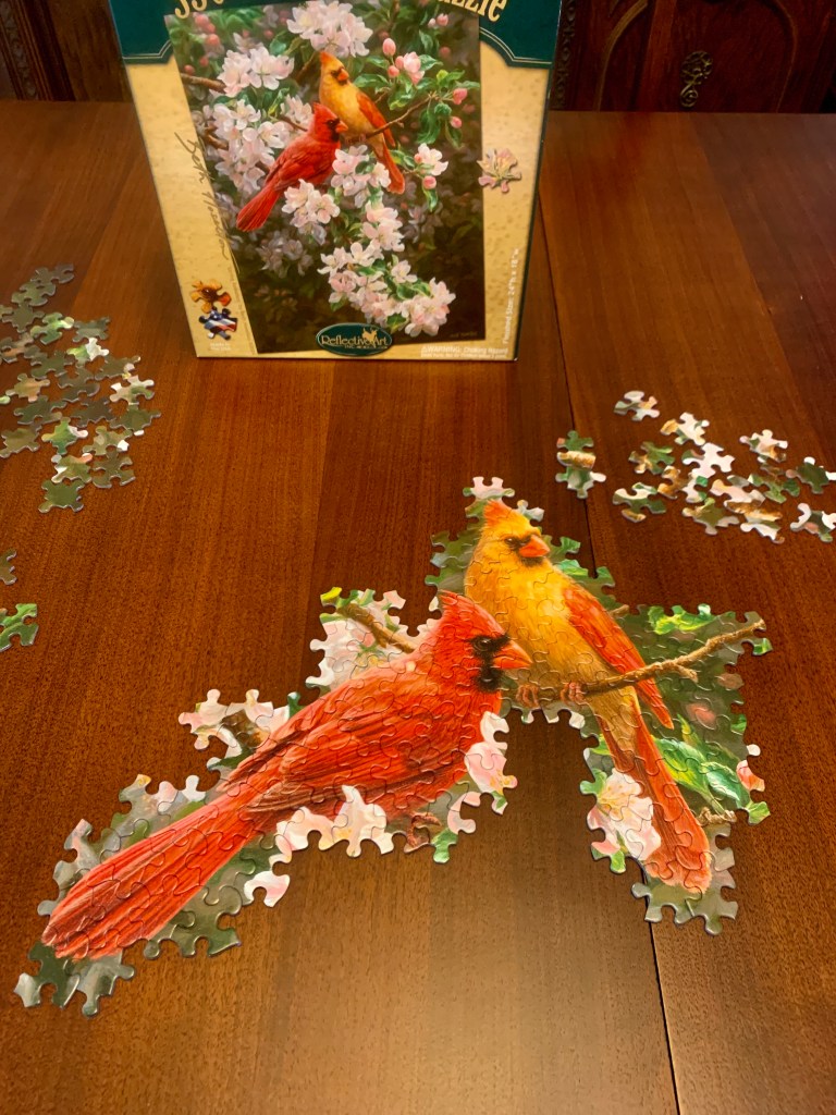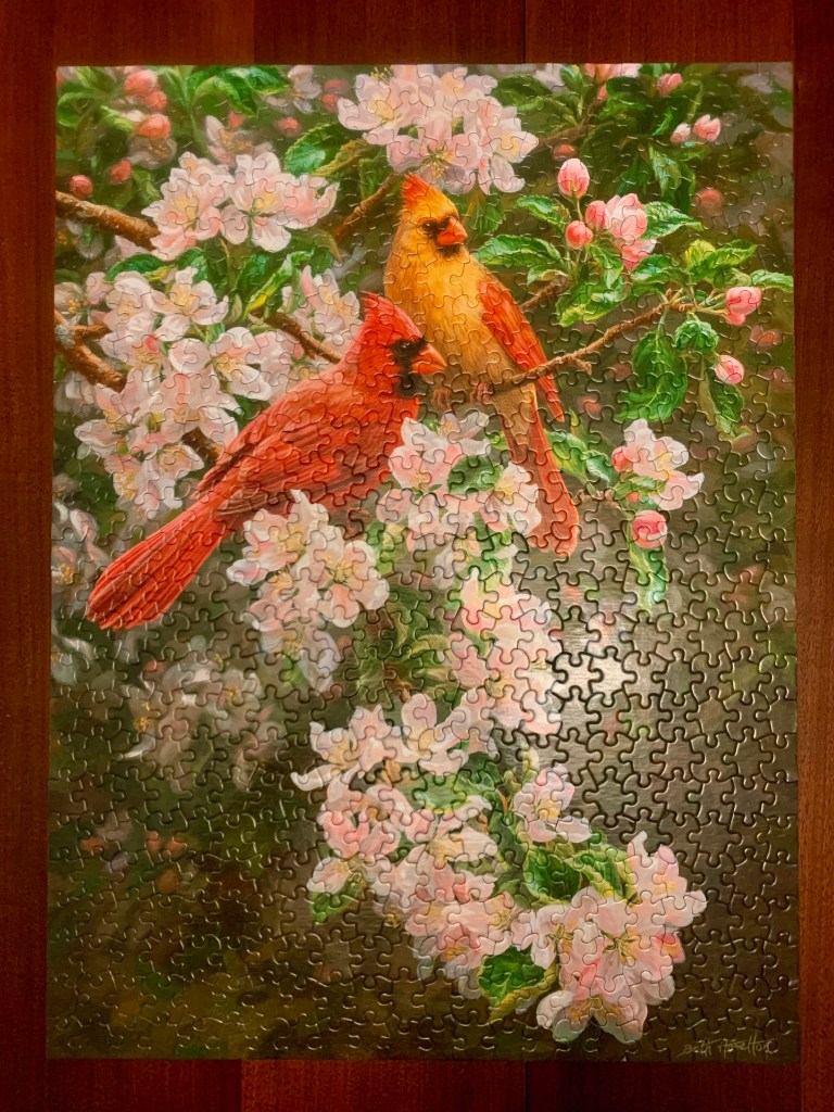 I don’t know how other people start a puzzle but I’ve always sorted out the border pieces and put them together first. Taking just a few steps beyond normal, I decided to work my last puzzle from the inside out. This was easy enough to do because of the bright colors of the birds. It was a little tougher after they were together but still manageable. It’s pretty obvious that boredom rules at my house! I need to do something about that.