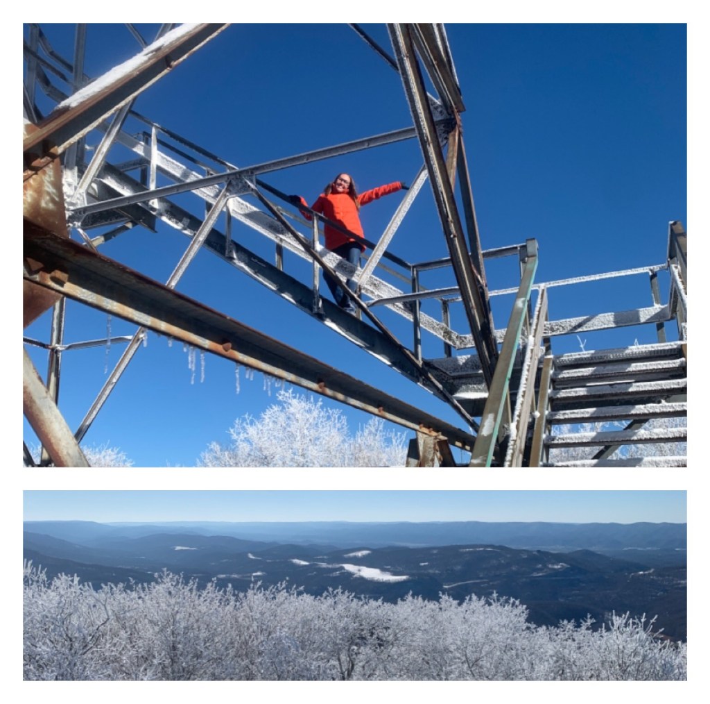 I was a little concerned that the road would be closed when we got there and I knew I wasn’t willing to hike 4 miles up the mountain. It was only 20°, which is too cold for my aching bones! With four wheel drive, we had no problems climbing the mountain and a short hike took us to the base of the tower where we hit the stairs. The sun was so bright that the snow and ice on the trees glittered. It was simply beautiful.